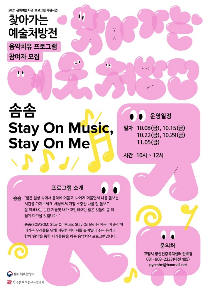 고양시 정신건강복지센터는 ‘솜솜 (SOMSOM : Stay On Music Stay On Me)’이라는 음악 치유 프로그램을 진행할 예정이다. 해당 프로그램은 따뜻한 에너지를 불어넣어 주는 음악으로‘음악을 통한 자기 돌봄’을 실현하는 음악 치유 프로그램이다.