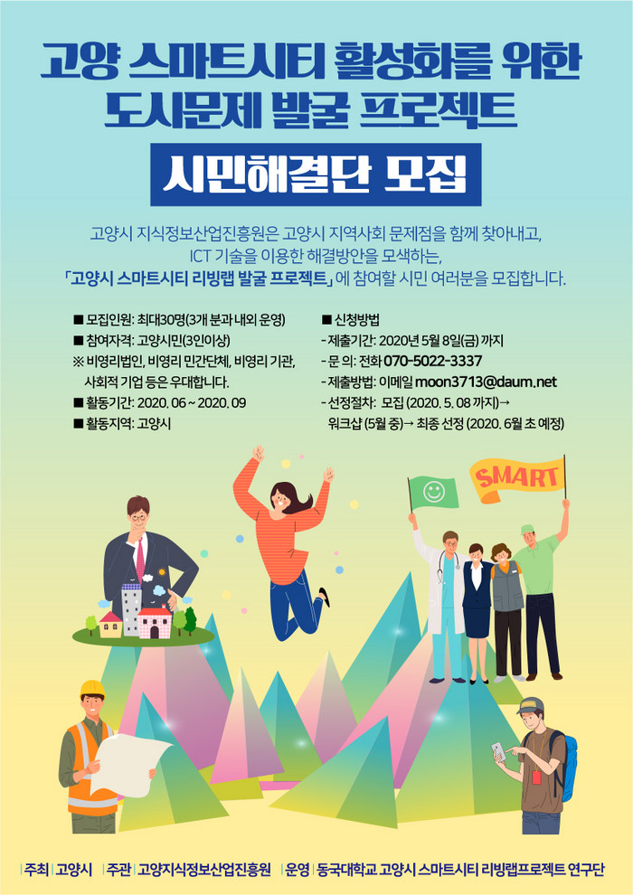 [부자동네타임즈 김인수기자] 고양지식정보산업진흥원(이하 진흥원)은 동국대학교 스마트시티 리빙랩 프로젝트 연구팀과 같이 5월 8일까지 IT 기술 기반으로 도시문제 발굴을 위한 시민해결단을 모집한다.