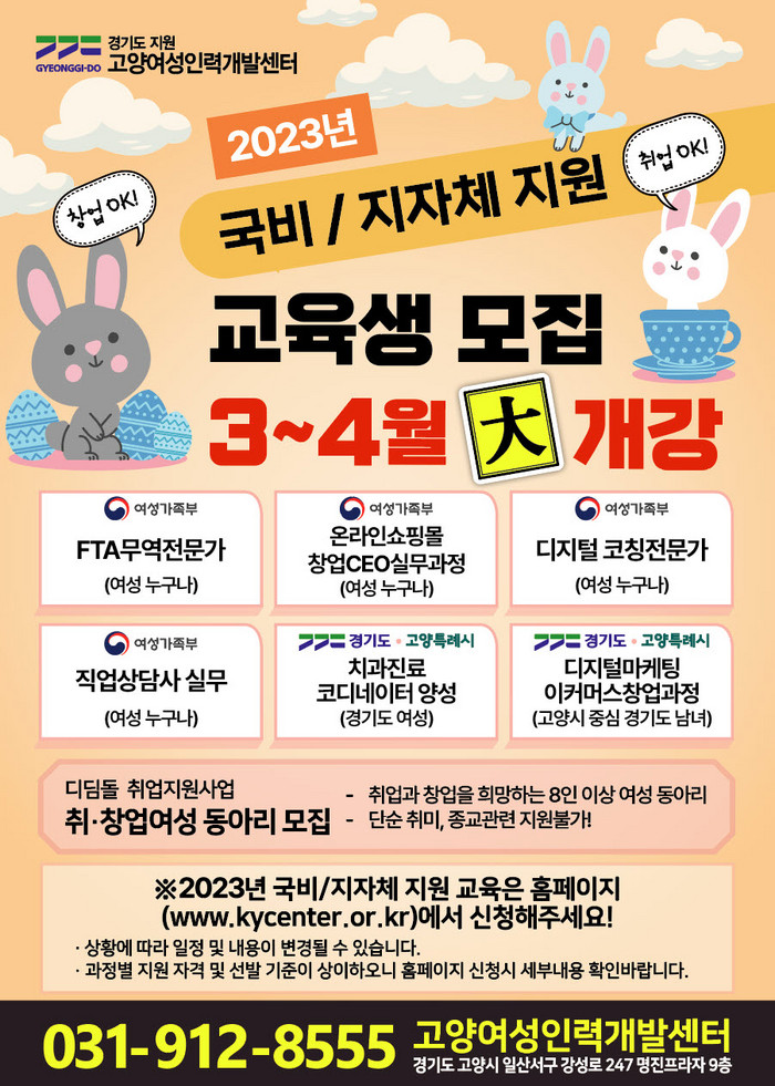 자세한 문의는 과정별 사전설명회 참석이나 고양여성인력개발센터 교육기획팀으로 하면 된다.