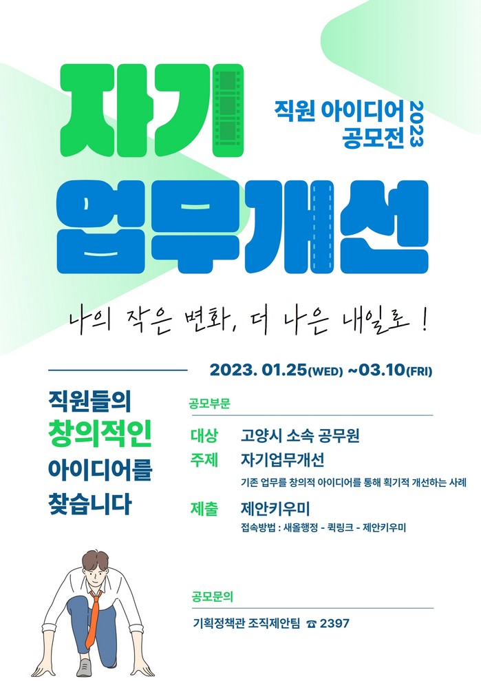 [부자동네타임즈 김인수기자] 고양특례시(시장 이동환)는 민선8기 공약사항 및 시정 역점사업 성공적 추진 아이디어 발굴을 위해 고양시 직원을 대상으로 ‘자기업무개선 공모전’을 개최한다.