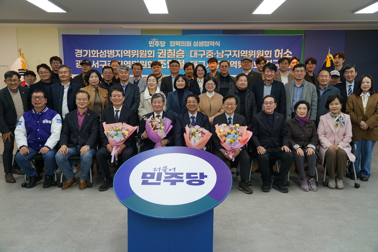 권칠승 의원은 지난 14 일 더불어민주당 대구시당에서 허소 대구시당 위원장 ( 중ㆍ남구 지역위원장 ) 과 ‘ 협력의원단 상생협약식 ’ 을 개최했다 . 이날 행사는 더불어민주당 조인철 국회의원 ( 광주서구갑 ) 과 최규식 서구 지역위원장도 참석한 합동 협약식으로 진행해 동서 화합의 기대를 높였다 .