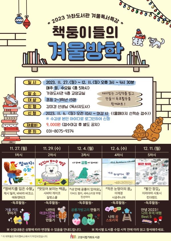 [부자동네타임즈 = 김인수 기자] 가좌도서관이 11월 27일부터 12월 11일까지 매주 월요일과 수요일에 어린이 겨울독서특강 ‘책둥이들의 겨울방학’을 운영한다.