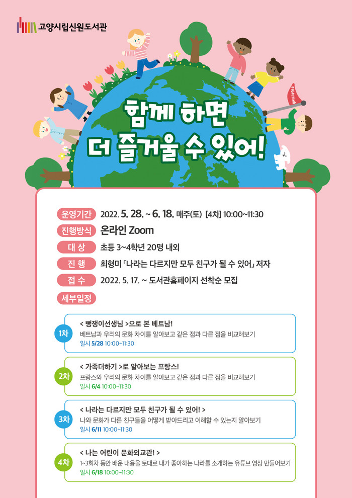 [부자동네타임즈 김인수기자] 고양시 신원도서관은 5월 28일부터 6월 18일까지 매주 토요일 초등 3~4학년을 대상으로 다문화프로그램 ‘함께 하면 더 즐거울 수 있어!’를 운영한다,