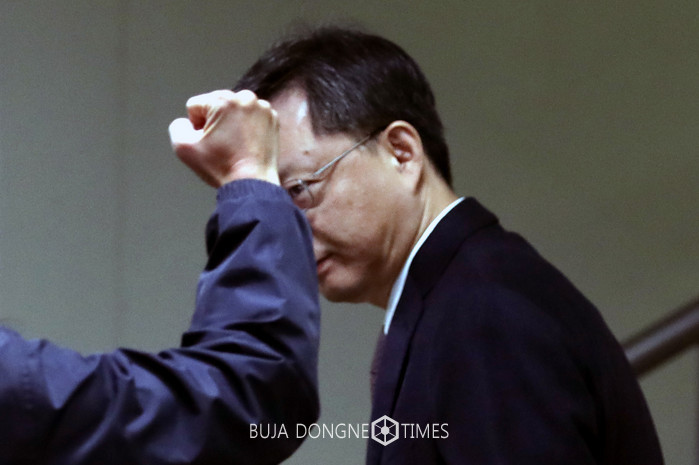 [부자동네타임즈 이세제 기자]'국정농단 방조' 우병우 전 민정수석이 24일 오전 서울 서초구 서울중앙지방법원에서 열린 23차 공판에 출석하는 가운데 한 시민이 '우병우 파이팅'을 외치자 쳐다보고 있다. 2017.11.24.