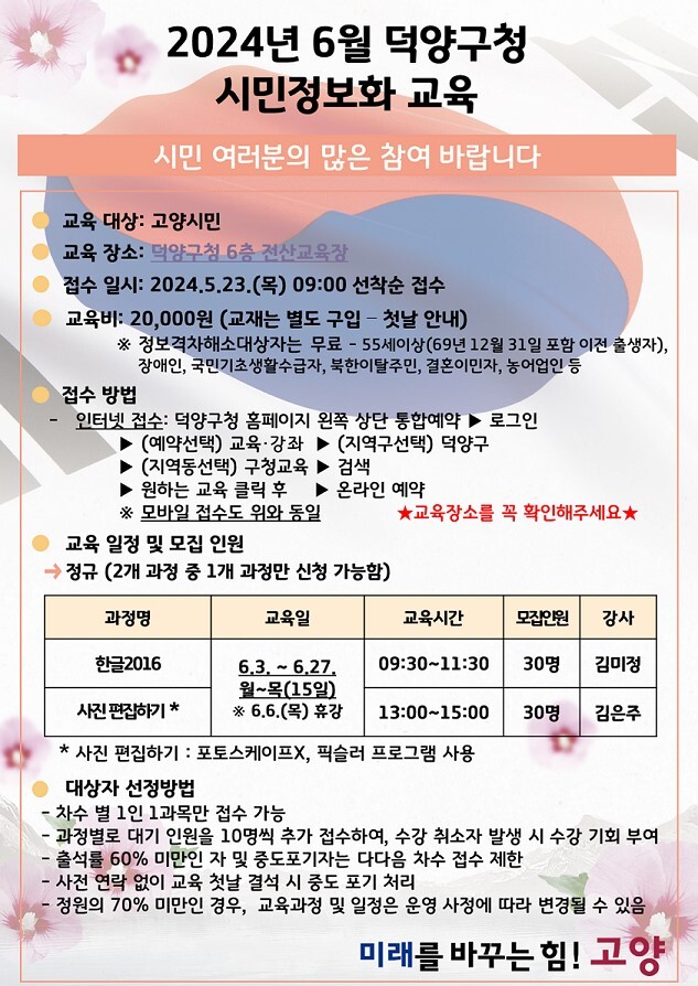 교육은 덕양구청 6층 전산교육장에서 진행되며, 접수는 덕양구청 누리집에서 온라인으로만 가능하다. 각 과정마다 선착순으로 30명씩 모집하며, 덕양구청 누리집의 ‘생활정보-교육-정보화 교육’ 또는 상단의 ‘통합예약-교육.강좌-정보화 교육’에서 신청할 수 있다.