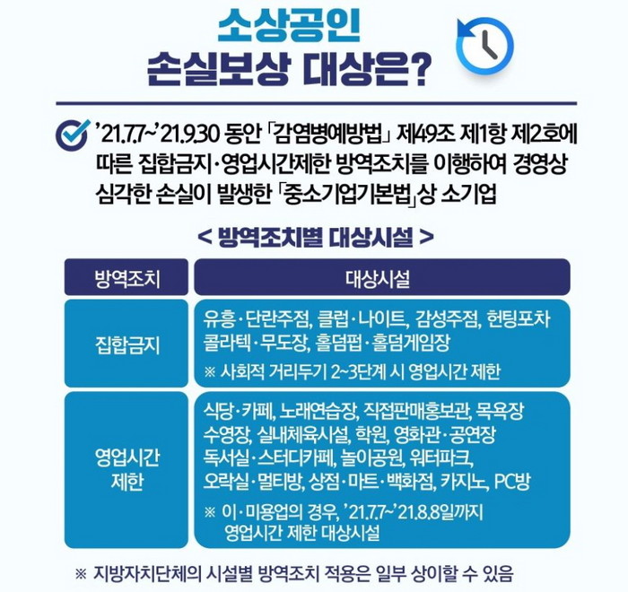 손실보상 대상은 올해 7월 7일부터 9월 30일 기간 동안 코로나19로 인하여 집합 금지나 영업시간 제한 조치를 받아 경영상 손실이 발생한 소기업 및 소상공인 등 18,000여개 사업체다.