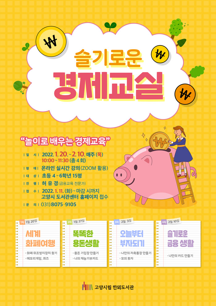 [부자동네타임즈 김인수기자] 고양시 한뫼도서관은 겨울 방학을 맞는 어린이들을 위해 1월 20일부터 2월 10일 까지 총 4회에 걸쳐 실생활에 필요한 금융지식을 배우는 슬기로운 경제 교실을 온라인으로 운영한다.