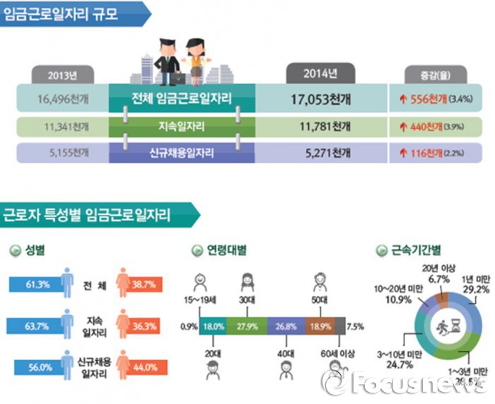 27일 통계청이 발표한 '2014년 임금근로일자리 행정통계'에 따르면 지난해 임금근로일자리 1705만3000개 중 57.7%인 984만7000개의 일자리를 근속기간 3년 미만이 점유했다.