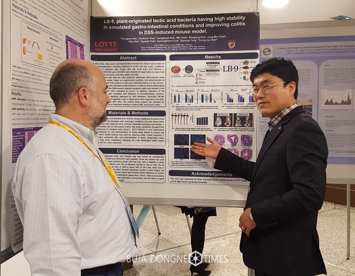 롯데중앙연구소(소장 여명재)는 지난 11월 30일 스페인 마드리드의 크라운 플라자 호텔에서 열린 ‘2017 식품 미생물 컨퍼런스(International Conference on Food Microbiology)’에김치에서 분리한 LB-9 유산균이 들어간 우유와 발효유의 장내 도달력과 장 건강 효과에 대한 연구 결과를 발표했다고 5일 밝혔다.