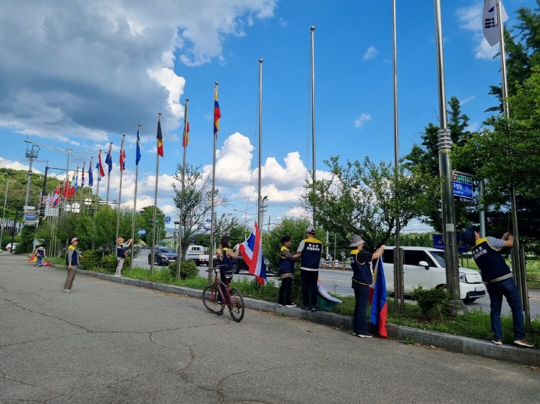 [부자동네타임즈 = 김인수 기자] 고양특례시 덕양구 관산동 주민자치회는 지난 3일 호국보훈의 달을 맞아 관산동 태극기 공원의 태극기와 필리핀군 참전 기념비 앞의 6·25전쟁 참전국 국기를 일제 정비했다고 밝혔다.