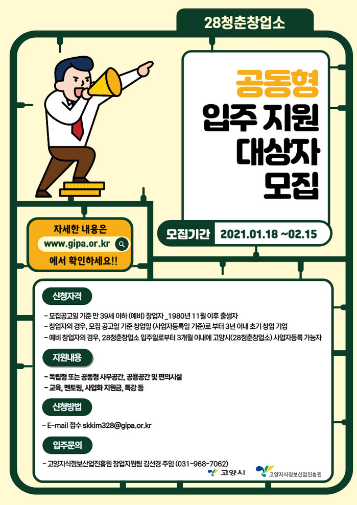 입주와 관련한 자세한 모집 공고 및 내용은 고양지식정보산업진흥원 홈페이지와 28청춘창업소로 문의하면 확인할 수 있다.
