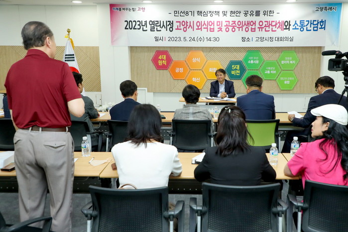 [부자동네타임즈 김인수기자] 지난 24일 관내 외식업 및 공중위생업 유관단체 관계자들이 참석한 가운데 고양시청 대회의실에서 ‘2023년 열린시정 고양시 외식업 및 공중위생업 유관단체(10개)와 소통간담회’를 개최했다.