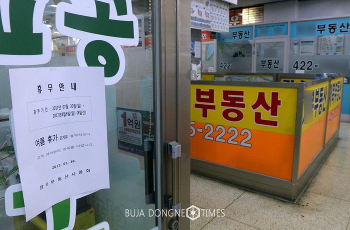 정부가 서울 전역과 과천시를 투기과열지구로 지정하고 강남 4구를 포함한 서울 11구, 세종시를 투기지역으로 지정하는 고강도 대책을 내놓았다. 2일 서울 잠실 부동산 중개업소에 여름 휴가를 알리는 안내문이 붙어 있다. 2017.08.02. 사진제공 뉴시스