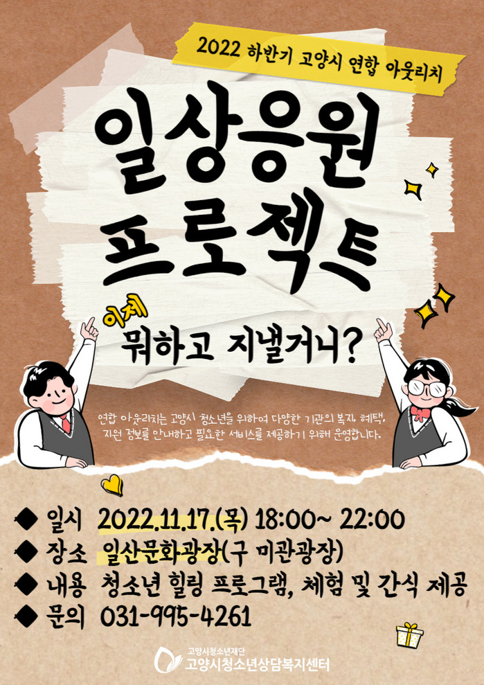[부자동네타임즈 김인수기자] 재단법인 고양시청소년재단(대표 이동환) 고양시청소년상담복지센터(센터장 황상하)는 오는 11월 17일(목) 고양시 청소년 유관기관과 함께 일상 응원 연합 아웃리치를 운영한다고 밝혔다.