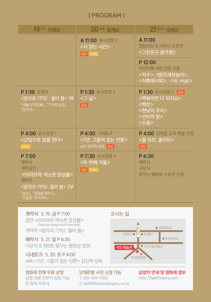 [부자동네타임즈 이언금 기자]제 8회를 맞이한 부산 평화영화제가 오는 5/19(금)~5/21(일), 3일간 '국도 예술관'에서 개최된다.