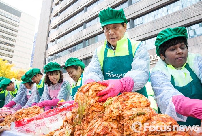 (서울=포커스뉴스) 11일 오후 서울 중구 을지로 KEB 하나은행 본점에서 열린 2015 모두하나데이 캠페인에 참석한 김정태 하나금융지주 회장을 비롯한 각 계열사 CEO 및 임직원들과 결혼이주여성들이 사랑의 김장나눔 봉사를 하고 있다.