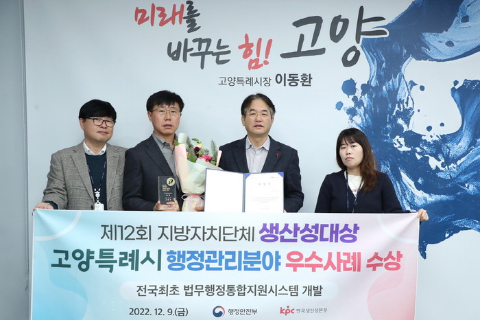 [부자동네타임즈 김인수기자] 지난 9일 행정안전부가 주최하고 한국생산성본부(KPC)가 주관한 ‘제12회 지방자치단체 생산성 대상’에서 고양특례시(시장 이동환)가 행정관리분야 우수기관으로 선정됐다.