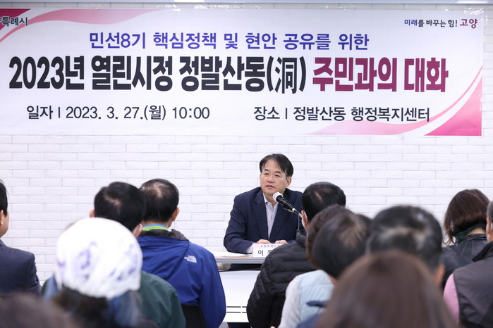 이동환 시장은 27일 정발산동 행정복지센터에서 ‘주민과의 대화’를 열고 “정부는 지금 1기 신도시를 포함한 노후계획도시 주민들의 주거여건 개선을 위해 특별법을 마련하고 있다”며 “부족한 자족시설과 기반시설의 확충 등이 전제된 정비구역에 사업이 원활하게 추진되도록 하겠다”고 약속했다.