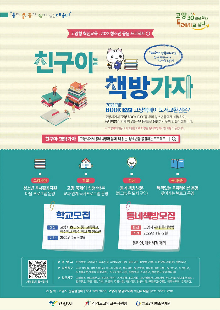 [부자동네타임즈 김인수기자] 고양시가 고양시 청소년들에게 1인당 15,000원 상당의 고양 북페이 ‘도서교환권’을 지급하는 친구야! 책방가자~ 프로젝트를 추진한다. 도서교환권은 고양시가 지정한 지역서점에서만 사용할 수 있다.