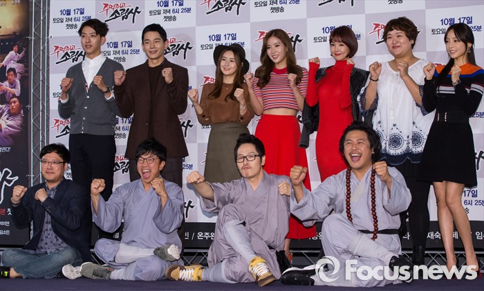 (서울=포커스뉴스) 13일 오후 서울 영등포구 여의도 CGV에서 열린 SBS 예능 프로그램 '주먹쥐고 소림사' 제작발표회에 참석한 이영준 PD(앞 줄 맨 왼쪽)를 비롯한 출연진이 포즈를 취하고 있다.