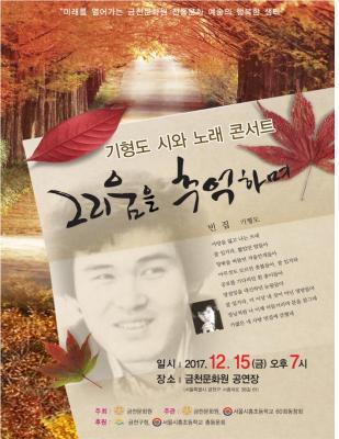 금천구(구청장 차성수)가 오는 15일(금) 오후 7시 금천문화원 공연장에서 금천문화원 주관으로 기형도 시와 노래 콘서트 ‘그리움을 추억하며’를 개최한다고 밝혔다.