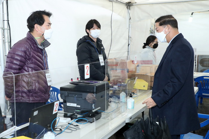 [부자동네타임즈 김인수기자] 제2차 경기도 재난기본소득 현장 접수가 실시된 첫날, 이재준 고양시장이 풍산동 행정복지센터를 방문하여 휴일임에도 근무 중인 관계자들을 격려하고 시민 불편사항이 발생하지 않도록 신속·정확히 진행해 줄 것을 당부하고 있다. 제2차 경기도 재난기본소득 현장 접수는 오는 4월 40일까지 고양시 39개 동 행정복지센터에서 실시한다.