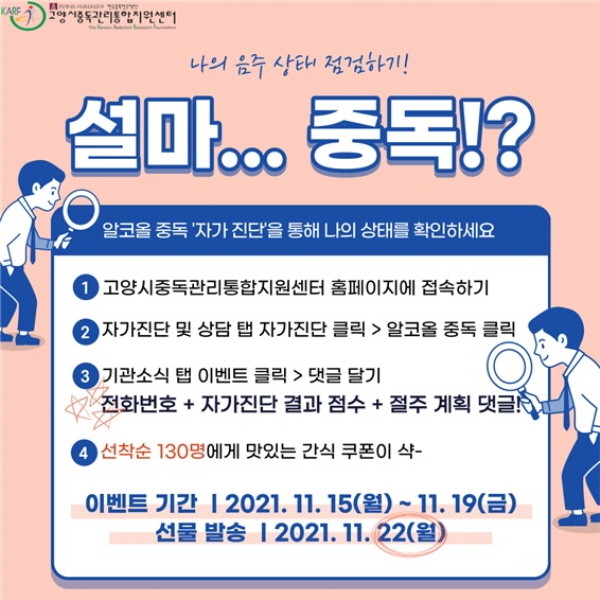 고양시 중독관리통합지원센터는 홈페이지에서 알코올 중독 자가 진단을 한 뒤 이벤트 게시판에 자신의 자가 진단 점수 게재 및 건강한 절주 계획을 댓글로 작성한 참여자 중 선착순 130명에게 소정의 상품을 지급할 계획이다.
