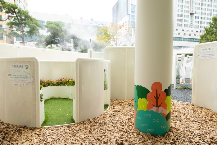 ‘안개-숲-놀이터’는 ▲식물의 향기를 맡고 모양을 관찰하는 ‘싱글생글 초록숲’ ▲구불구불한 길 위에서 가위바위보 놀이를 즐기는 ‘꼬불꾸불 놀이숲’ ▲바람개비와 무지개 천을 활용해 바람을 만들어보는 ‘하롱하롱 바람숲’ ▲거대한 팽이를 타고 빙그르르 돌아보는 ‘빙글뱅글 팽이랑’ ▲삐쭉빼쭉 수풀숲 ▲둥실둥실 구름숲 ▲쫑긋쭝긋 친구랑 등 다양한 체험 공간으로 구성되어 있다.