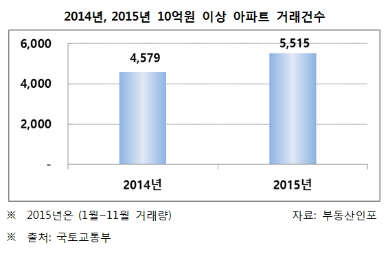 10일 부동산정보업체 부동산인포가 국토교통부 실거래가(1월~11월말) 데이터를 분석한 결과에 따르면 전국에서 10억원 이상에 매매된 아파트 거래 건수는 총 5515건을 기록했다.