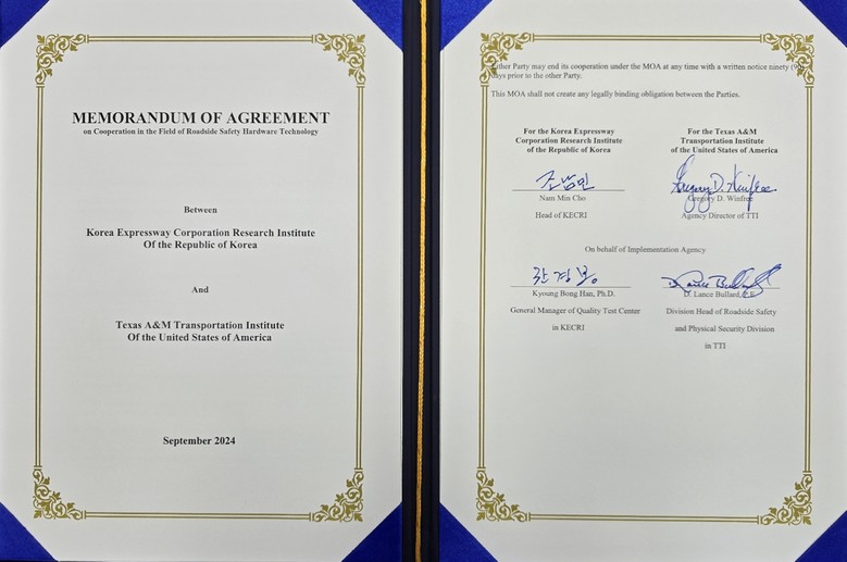 한국도로공사(사장 함진규)는 지난 9월 27일 도로교통연구원이 아시아 최초로 실물충돌시험에 대한 미국 인증을 취득하고, 텍사스교통연구원(TTI)*과 관련 업무협약을 체결했다고 밝혔다.