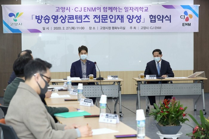 이재준 고양시장과 허민회 CJ ENM 대표는 27일 오전 고양시청 평화누리실에서 방송영상 콘텐츠 전문 인재 양성을 위한 업무협약을 체결했다.