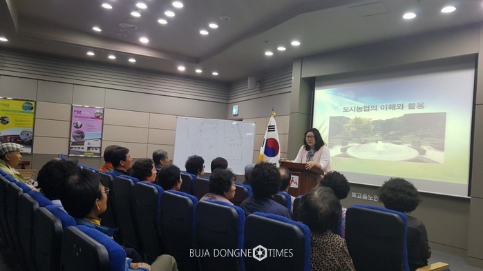 | △텃밭 체험을 희망하는 어르신들과 빛고을노인건강타운 문혜옥 본부장을 비롯하여 광주광역시농업기술센터 이행숙 소장, 미래농업과 김시라 도시농업팀장, 양현철 농춘지도사가 참석하여 '자연 치유형 텃밭조성'사업의 취지와 '도시농업'에 대한 설명회를 가졌다 |