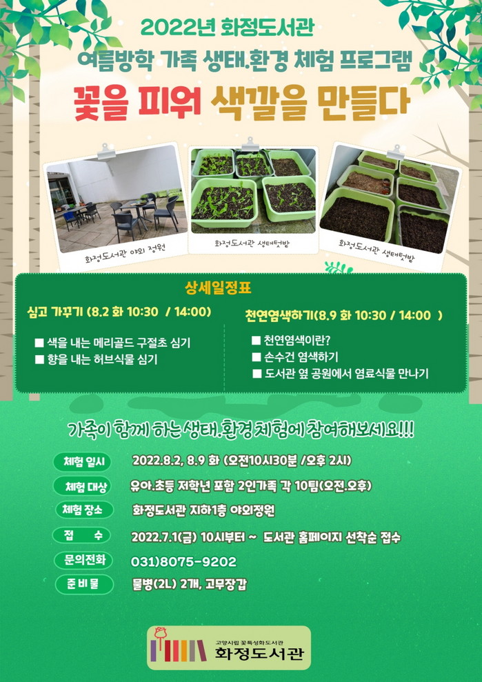 [부자동네타임즈 김인수기자] 고양시(시장 이동환) 꽃 특성화 도서관 화정도서관이 초등학생과 유아를 대상으로 여름방학 가족 생태.환경 체험 프로그램 꽃을 피워 색깔을 만들다를 운영한다.