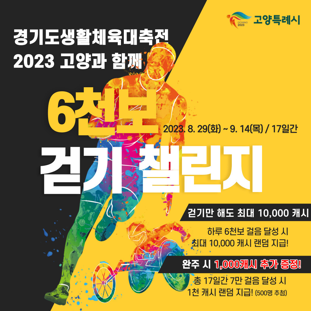 또한 건강관리 앱인 ‘캐시워크’를 통해 ‘‘2023 경기도생활체육대축전과 함께하는 6천보 걷기 챌린지’와 ‘개회식 스탬프 챌린지’가 진행된다.