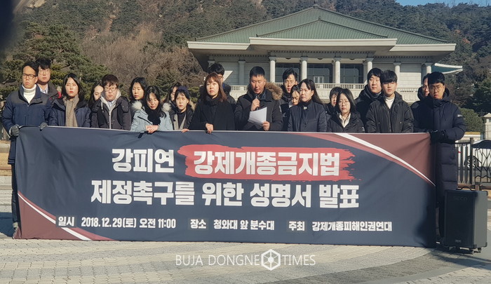 [부자동네타임즈 이세제 기자]강제개종 사망 이후 올해 피해 접수만 150건…“강제 개종 목사 처벌 안돼 범죄 성행” 강제개종피해인권연대(공동대표 박상익, 최지혜‧이하 강피연)가 29일 강제 개종 과정에서 숨진 故구지인씨 1주기를 앞두고 청와대 앞에서 강제개종금지법 제정을 촉구했다.