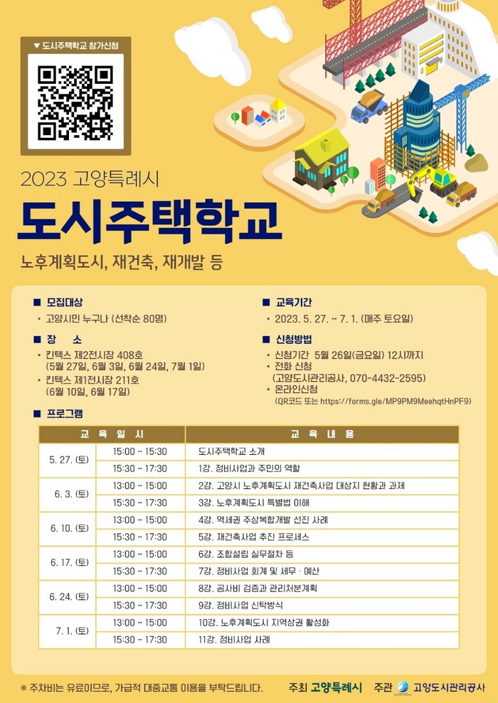 고양시의 성공적 도시정비 정책 수행을 지원하고자 개최되는 이번 도시주택학교에서는 5월 27일 도시주택학교 소개를 시작으로 총 11강에 걸쳐 정비사업과 재건축사업의 기본 이해와 실무절차 및 선진 사례에 대해 각 분야의 전문가가 강연이 진행된다.