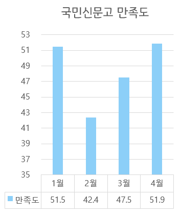 접수된 국민신문고 민원의 처리현황을 분석한 결과, 민원처리결과의 시민 만족도는 51.9%로, 전월 대비 4.4% 향상되었다. 올해 국민신문고 민원처리 시민 만족도는 1월 51.5%, 2월 42.4%, 3월 47.5%로 향상 추세에 있으며, 4월에는 전월보다 많은 양의 민원을 처리했음에도 불구하고 올해 들어 가장 높은 만족도를 기록했다.