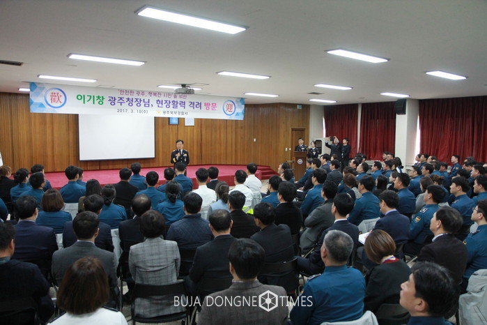 이날 이 청장은 광주청 지휘부 3명 등 130여 명이 참여한 가운데 현장 경찰청장이 북부경찰서를 방문해 일선 경찰관들과의 공감대 형성을 위해 애로사항을 청취하는 한편, 유공 경찰관 2명에게 표창을 수여하며 격려하기도 했다. 이 청장은 "기본과 원칙에 충실한 당당하고 자신감 있는 치안활동을 펼쳐 달라."고 당부하며 "사회적 약자의 손을 잡아주는 경찰이 되길 바라고 안전한 광주와 행복한 시민을 만드는데 최선을 다하자."고 다짐했다.