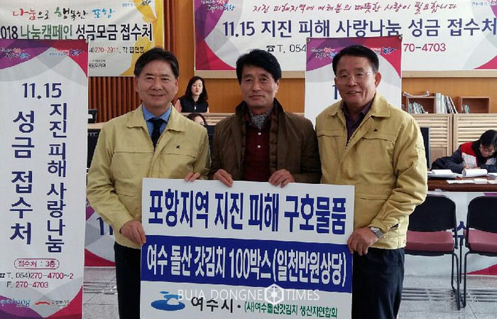 [부자동네타임즈 손권일 기자]여수 특산품인 돌산갓김치가 11월 15일 지진 피해를 입은 포항시에 전달됐다.