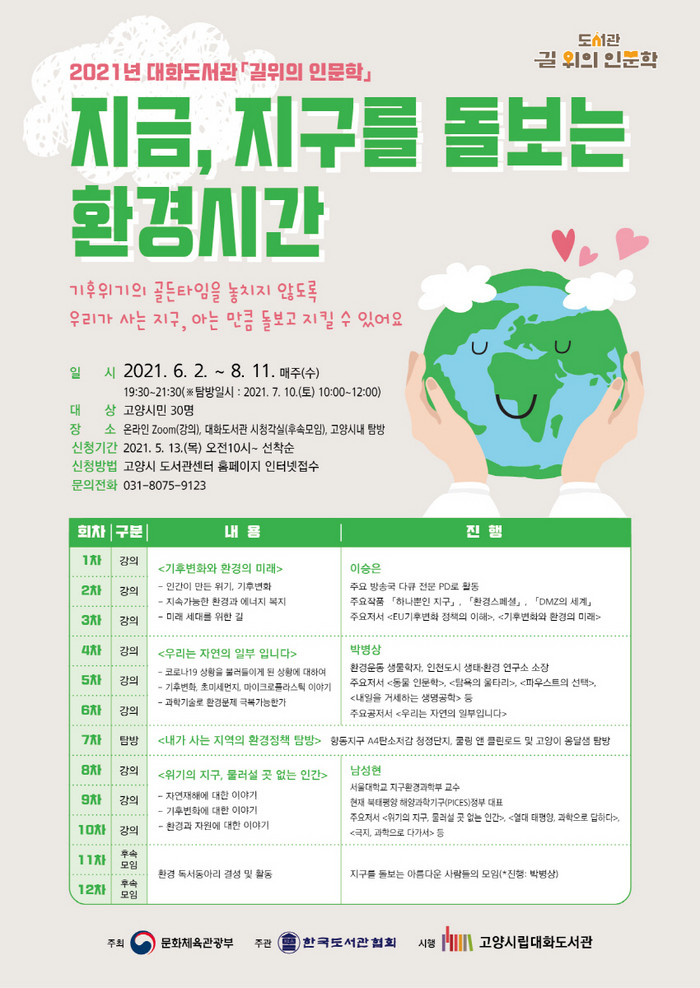 이번 프로그램은 환경분야 전문가 강의 9회, 고양시 환경 관련 장소탐방 1회, 후속 모임 2회로 구성된다. 강의는 비대면 온라인(Zoom)으로 진행되며, 후속모임은 대화도서관 시청각실에서 진행될 예정이다.