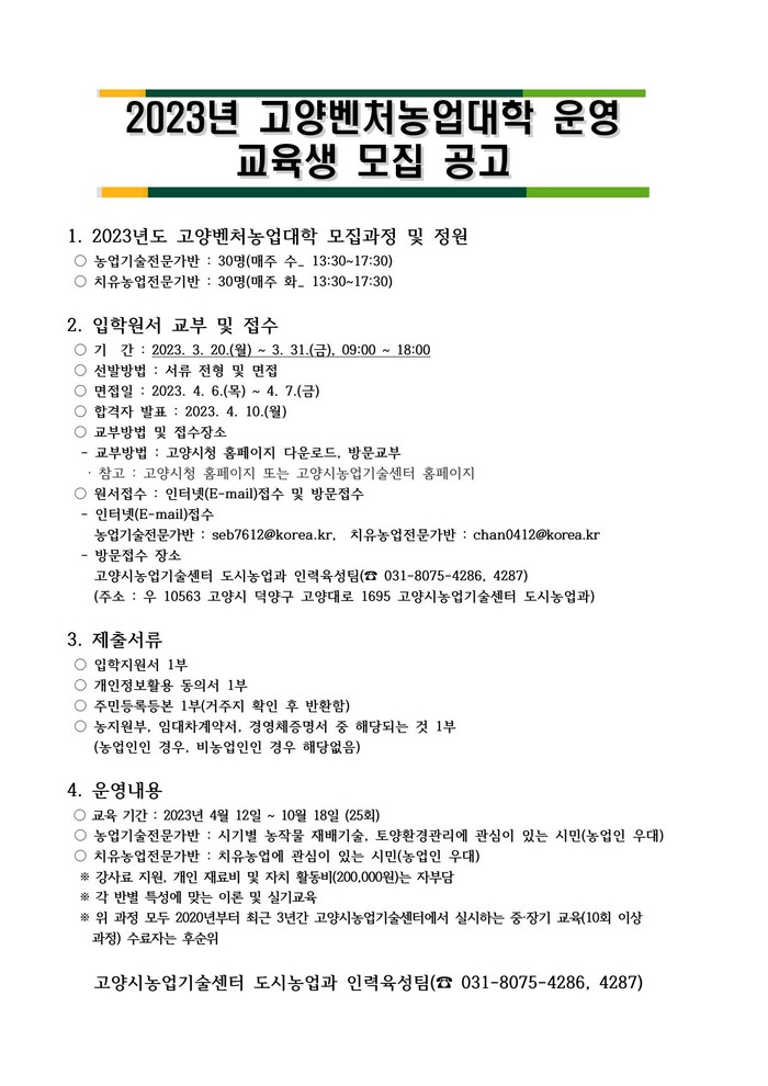 [부자동네타임즈 김인수기자] 고양시농업기술센터에서 미래 농업을 선도할 2023년도 고양벤처농업대학 교육생을 3월 31일까지 모집한다.