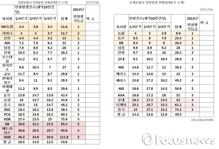 메트라이프생명 95.8건, KB생명 95.4건으로 많았다. 분기별로 보면 메트라이프생명의 민원 발생 건수는 1분기(40.6건), 2분기(29.5건), 3분기(25.7건)이었고, KB생명은 1분기(39.8건), 2분기(32.1건), 3분기(23.5건)이었다.