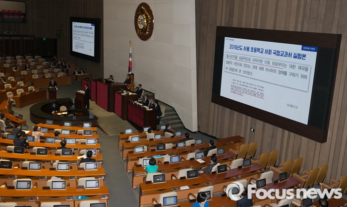 | △ 민병두 새정치민주연합 의원이 13일 오전 서울 여의도 국회에서 열린 337회 국회(정기회) 6차 본회의, 정치에 관한 질문에 참석해 황교안 국무총리에게 역사교과서 국정화 관련 질문하고 있다. 박동욱 기자 fufus@focus.kr |