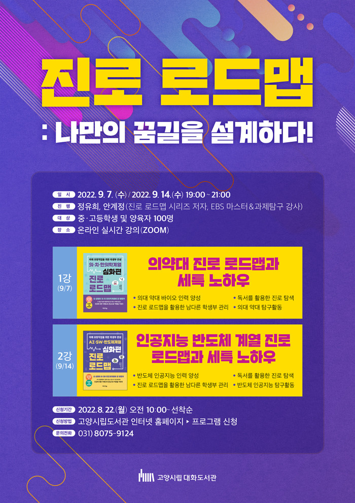 [부자동네타임즈 김인수기자] 고양특례시(시장 이동환) 대화도서관이 오는 9월 7일부터 청소년과 학부모를 대상으로 진로 탐색 프로그램 진로 로드맵: 나만의 꿈길을 설계하다!을 온라인으로 운영한다.