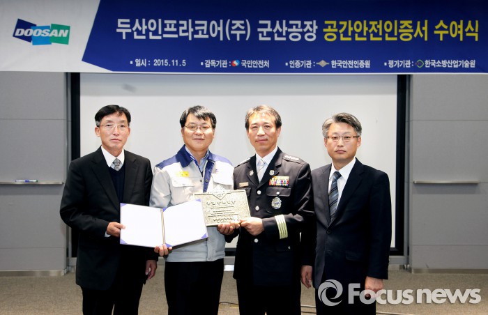 [부자동네타임즈 이채봉 기자] 두산인프라코어는 6일 군산공장이 국민안전처로부터 공간안전인증을 받았다고 밝혔다.