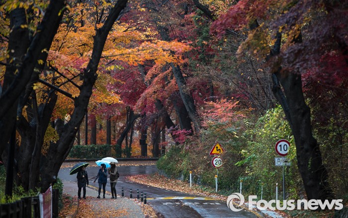 (서울=포커스뉴스) 촉촉한 가을비가 내리는 18일 오전 시민들이 서울 남산타워 인근을 걸으며 가을비 내리는 늦가을의 서울을 즐기고 있다.