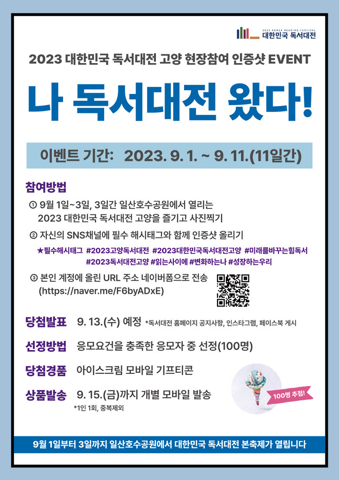 이벤트 ‘나 독서대전 왔다’은 9월 1일부터 11일까지 운영된다. 참여방법은 축제 현장을 배경으로 찍은 인증 사진을 필수 해시태그(#2023고양독서대전 #2023대한민국독서대전고양 #미래를바꾸는힘독서 #읽는사이에 #변화하는나 #성장하는우리)와 함께 자신의 페이스북이나 블로그 등 소셜미디어(SNS)에 올리고 링크 주소를 네이버폼으로 제출하면 된다.
