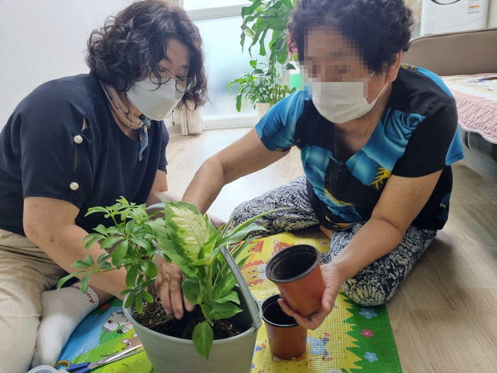 해당 사업은 독거노인 한 명당 10회 방문으로 총 150회 진행됐다. 고무나무 분갈이 아이비 화분 만들기, 행운목 수경재배 등 원예치유 프로그램과 꽃차 마시기, 좋은 글귀 읽기 등 정서안정을 위한 활동이 병행됐다.