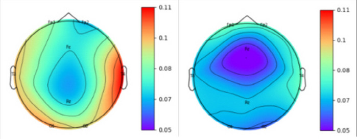 [사진설명] 원예치유 전후 뇌파 측정 사진 (푸른색을 띌수록 스트레스가 감소됨을 나타낸다)