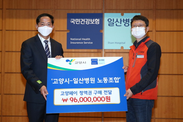 [부자동네타임즈 김인수기자] 고양시는 지난 9일 국민건강보험공단 일산병원 노동조합(이하 일산병원 노조)에서 코로나19로 침체된 지역경제 활성화를 위해 고양페이 정액권(6만 원권) 약 1,600매를 구매했다.